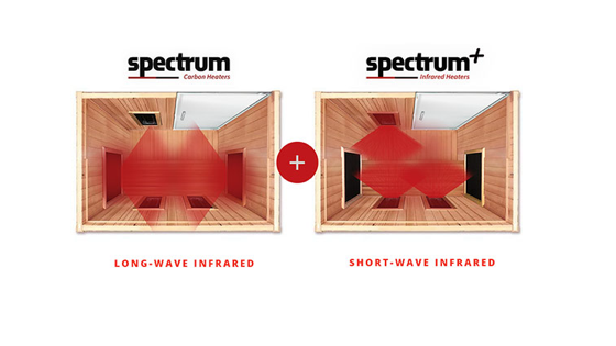 • Full Spectrum Sauna combination of long-wave Spectrum Carbon 360 infrared panels with UL-listed short-wave Spectrum Plus™ infrared panels. This combination provides higher temperatures, full body coverage, deeper penetration, and better experience than any other sauna.
